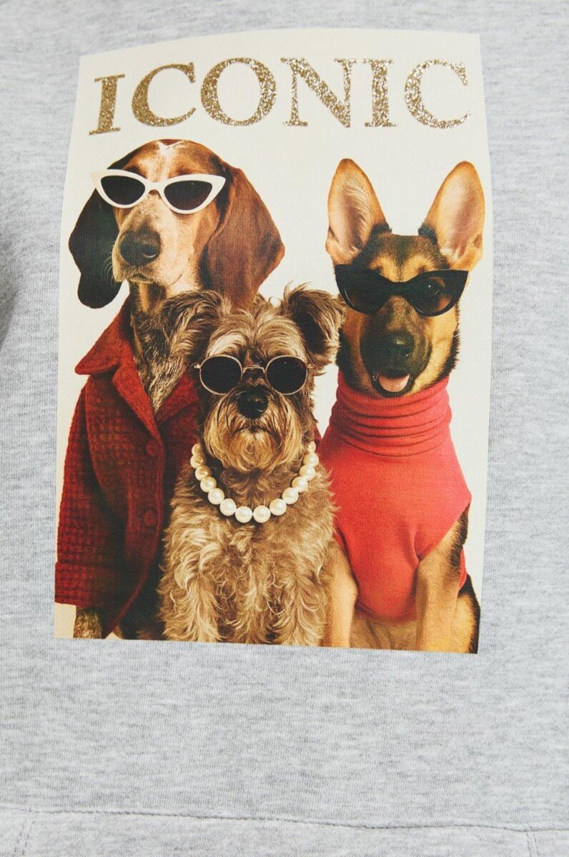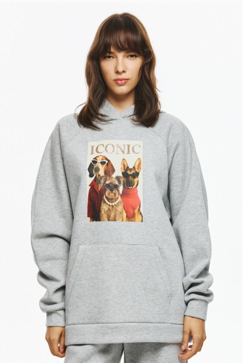 Φούτερ με κουκούλα σε φαρδιά γραμμή. Στο μπροστινό μέρος υπάρχει στάμπα με τρία σκυλιά και στυλιστικά αξεσουάρ και η λέξη iconic με χρυσά γράμματα.