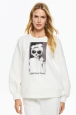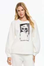 Oversized φούτερ με φουσκωτά μανίκια και στρογγυλή λαιμόκοψη. Στο μπροστινό μέρος έχει στάμπα με ασπρόμαυρη φωτογραφία παιδιού που φοράει φιόγκο και μεγάλα γυαλιά, κρατώντας κραγιόν, με το κείμενο “Glam Starts Young!” από κάτω. Ο φιόγκος στη στάμπα είναι διακοσμημένος με πέρλες για έξτρα λάμψη.