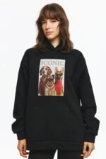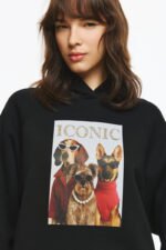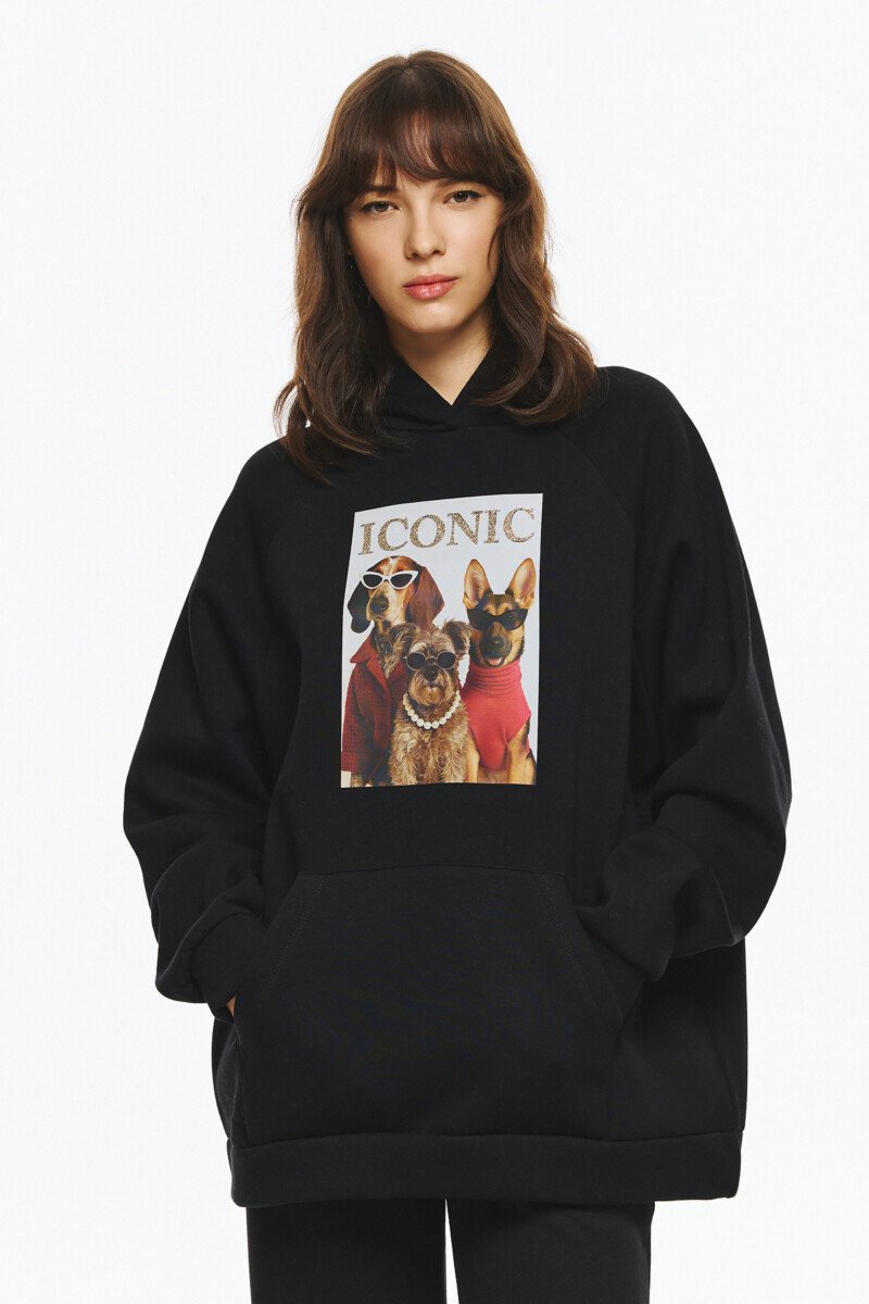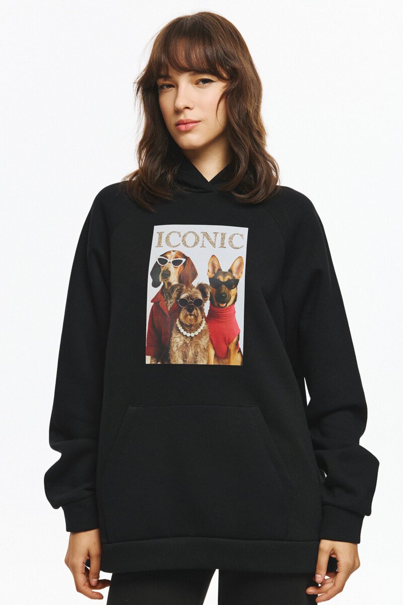 Φούτερ με κουκούλα σε φαρδιά γραμμή. Στο μπροστινό μέρος υπάρχει στάμπα με τρία σκυλιά και στυλιστικά αξεσουάρ και η λέξη iconic με χρυσά γράμματα.