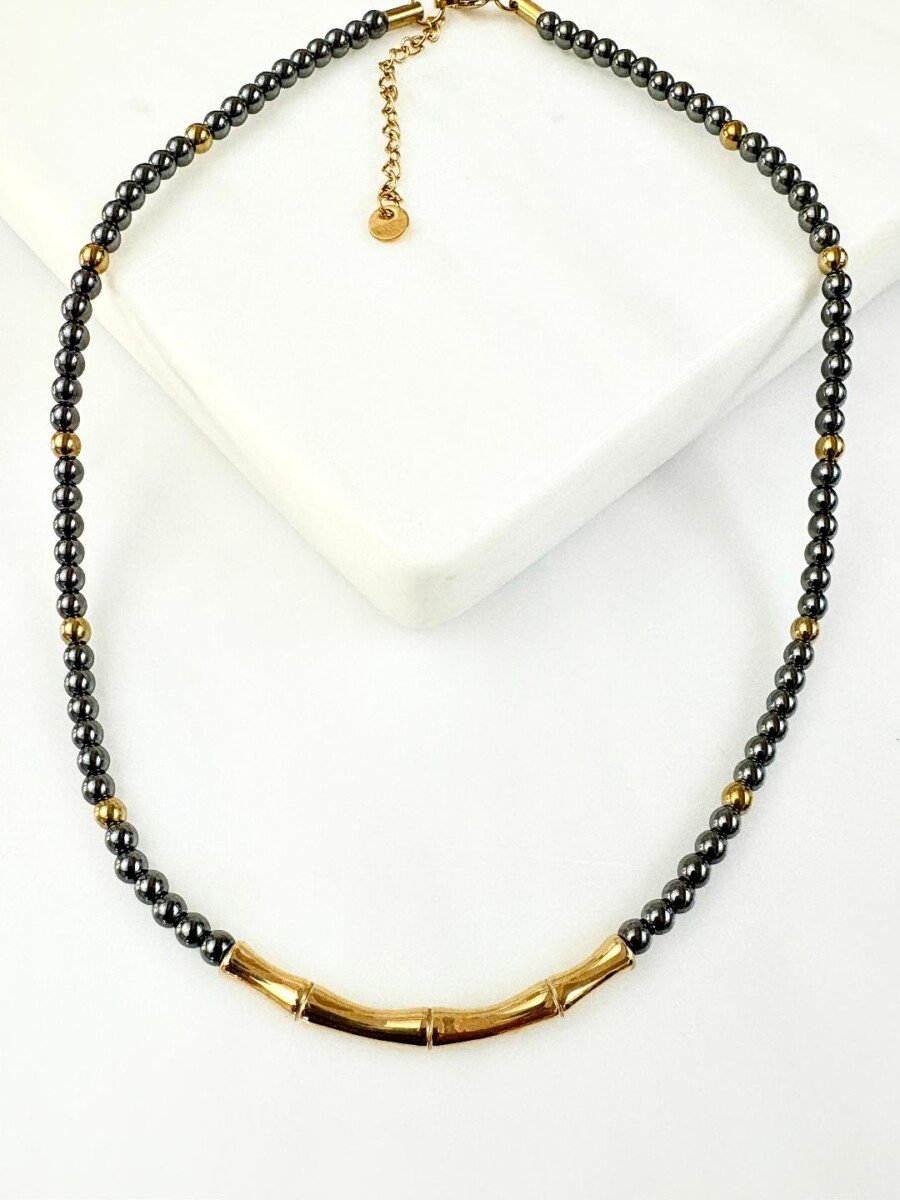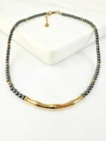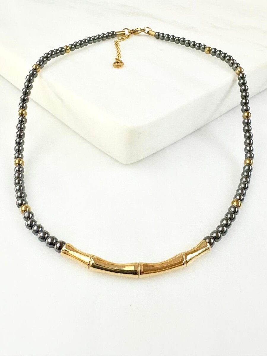Κοντό κολιέ από αιματίτες σε ανθρακί και χρυσό χρώμα και στοιχείο μπαμπού απο ανοξείδωτο ατσάλι 304 επιχρυσωμένο με 18Κ