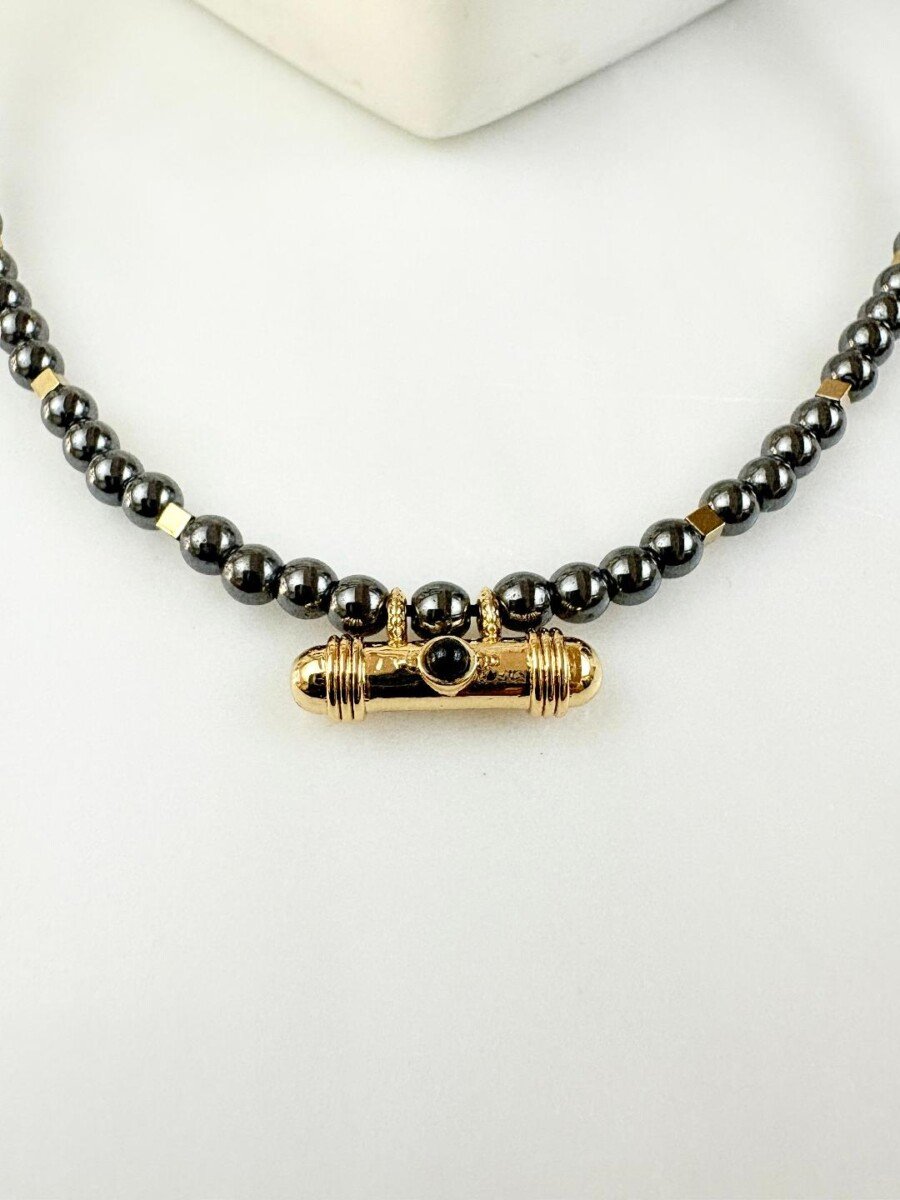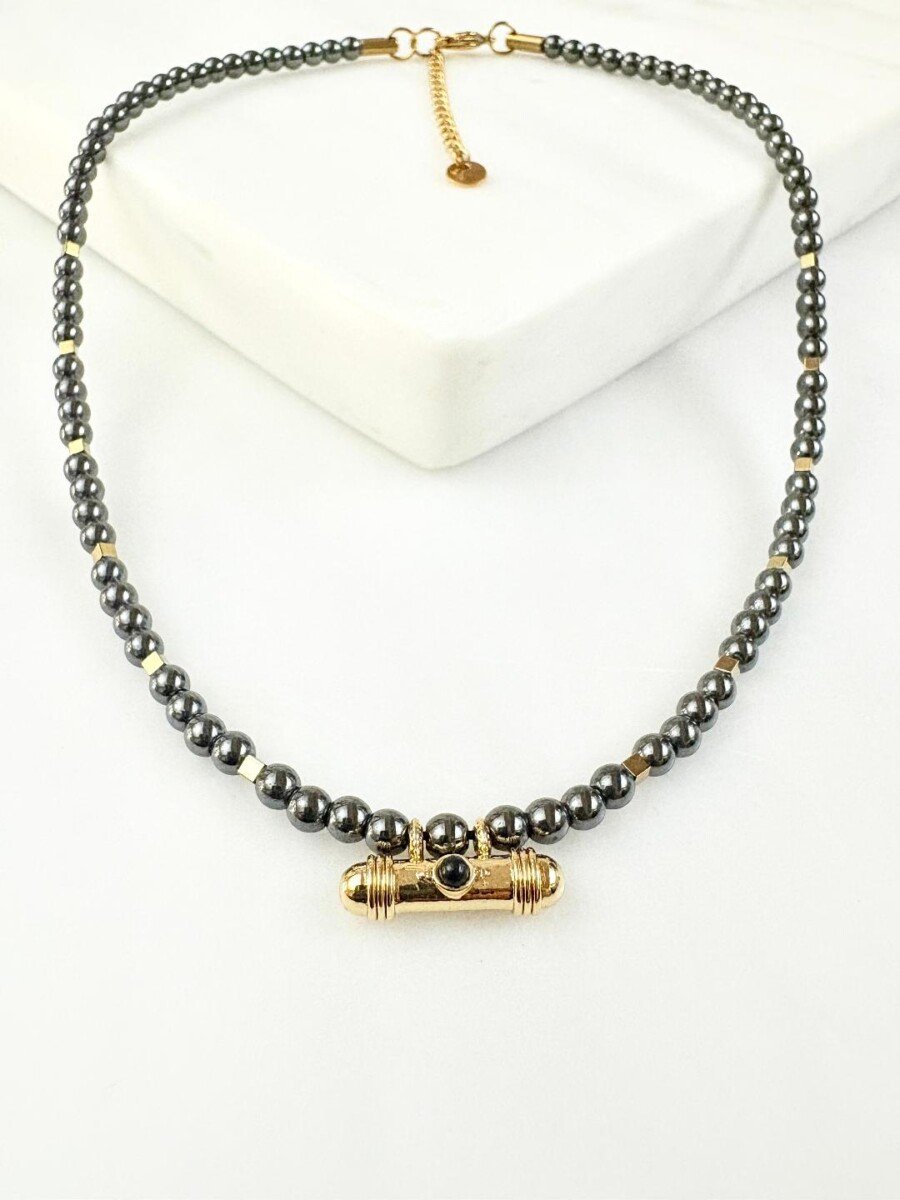 Κοντό κολιέ από αιματίτες σε ανθρακί και χρυσό χρώμα και μεταλλικό ζάμακ στοιχείο 24Κ επίχρυσο και μαύρο ζιργκόν