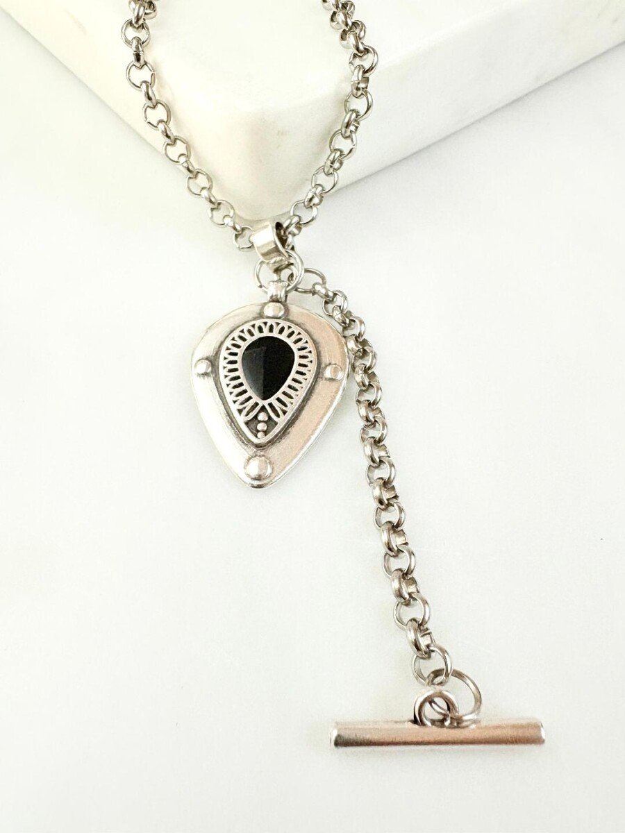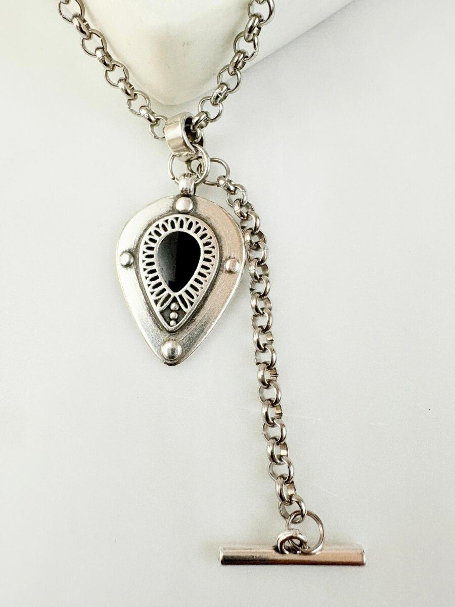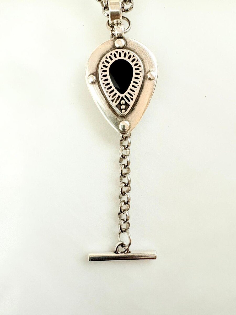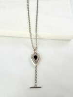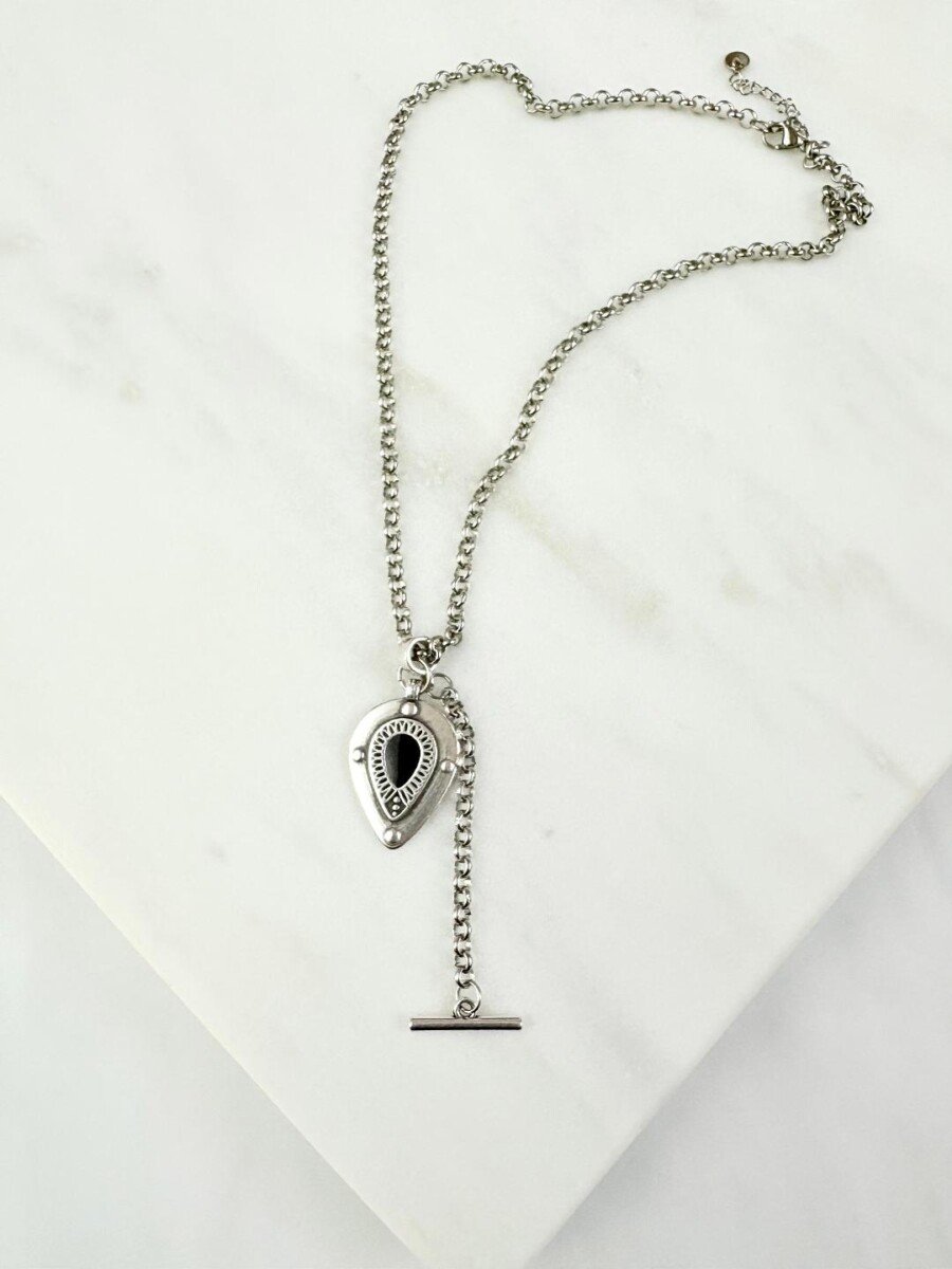 Κολιέ από ατσάλινη  αλυσίδα με εντυπωσιακό στοιχείο επάργυρο αντικέ με μαύρο σμάλτο και κρεμαστή αλυσίδα με μπάρα στο τελείωμα