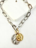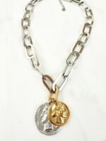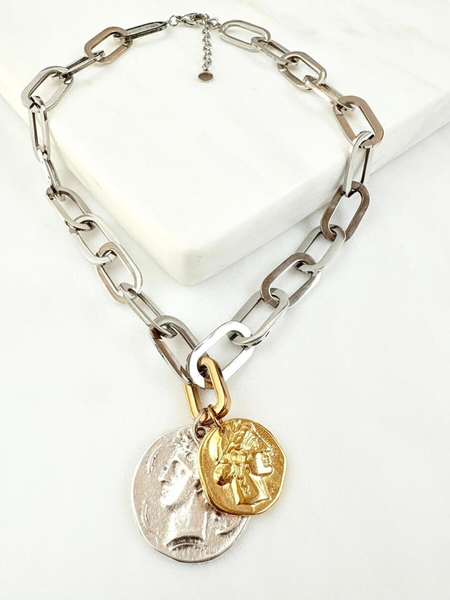 Κοντό κολιέ από ατσάλινη φαρδιά αλυσίδα με μεταλλικά ζάμακ νομίσματα επάργυρο αντικέ 999  και επίχρυσο 24Κ
