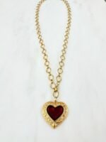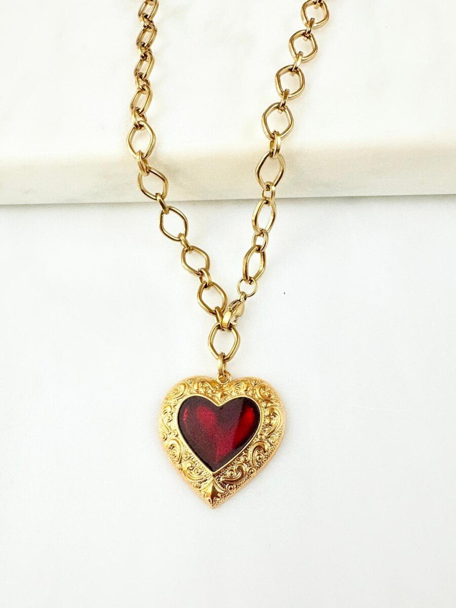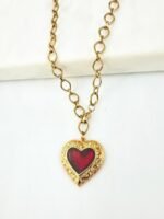 Κολιέ από ατσάλινη φαρδιά αλυσίδα  επίχρυση με εντυπωσιακή vintage καρδιά και σμάλτο σε βαθύ κόκκινο χρώμα