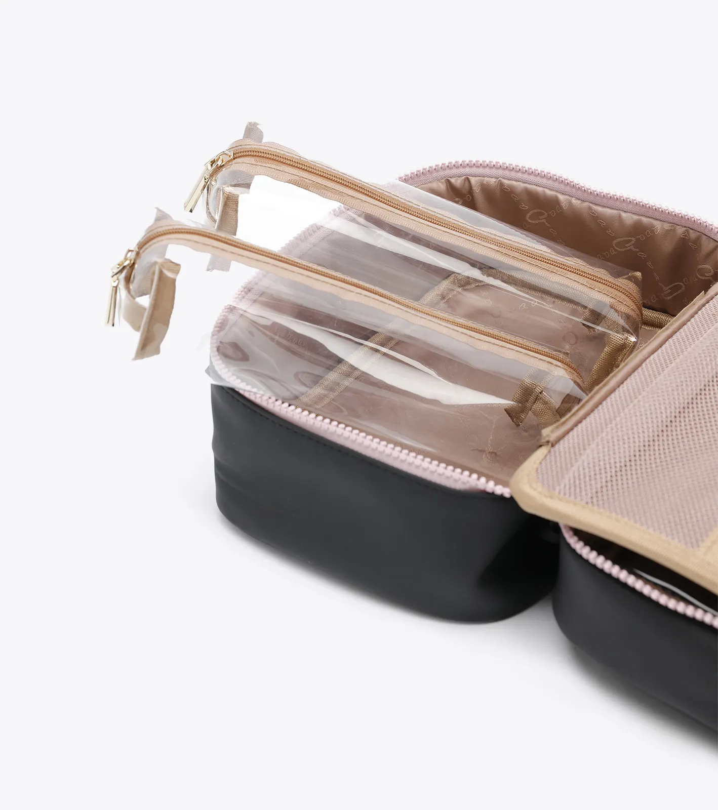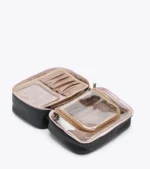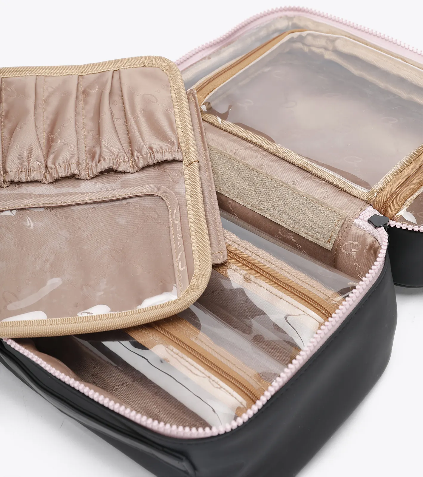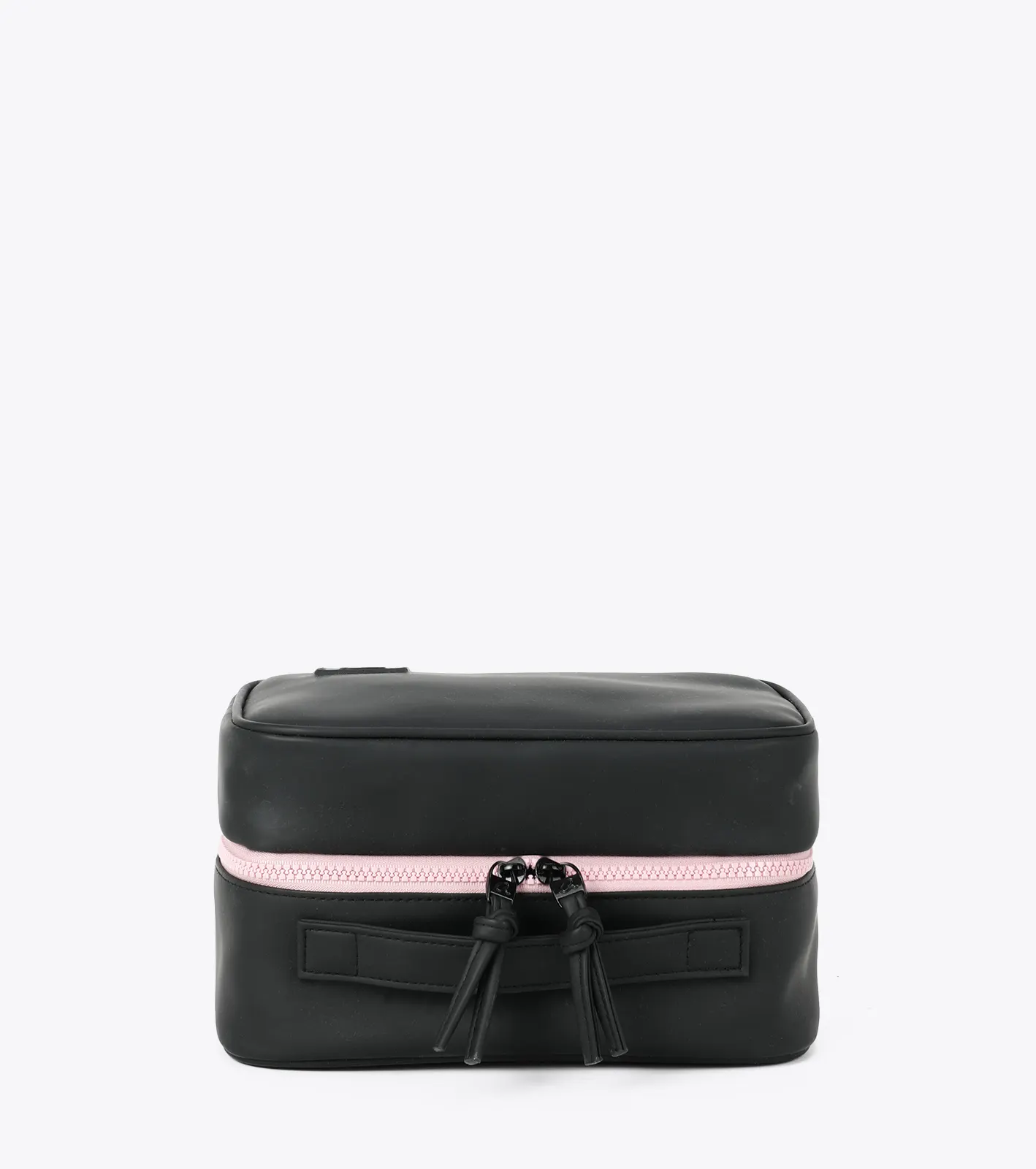 Γυναικείο νεσεσέρ ταξιδίου σε μαύρη απόχρωση με ροζ λεπτομέρεια φερμουάρ. Στο εσωτερικό του είναι επενδυμένο με φόδρα και περιέχει δύο διάφανες αποσπώμενες κασετίνες, θέσεις για πινέλα, διάφανη θήκη με φερμουάρ και άδεια μπουκαλάκια για ρευστά αντικείμενα. Ένα απαραίτητο αξεσουάρ για κάθε ταξίδι.