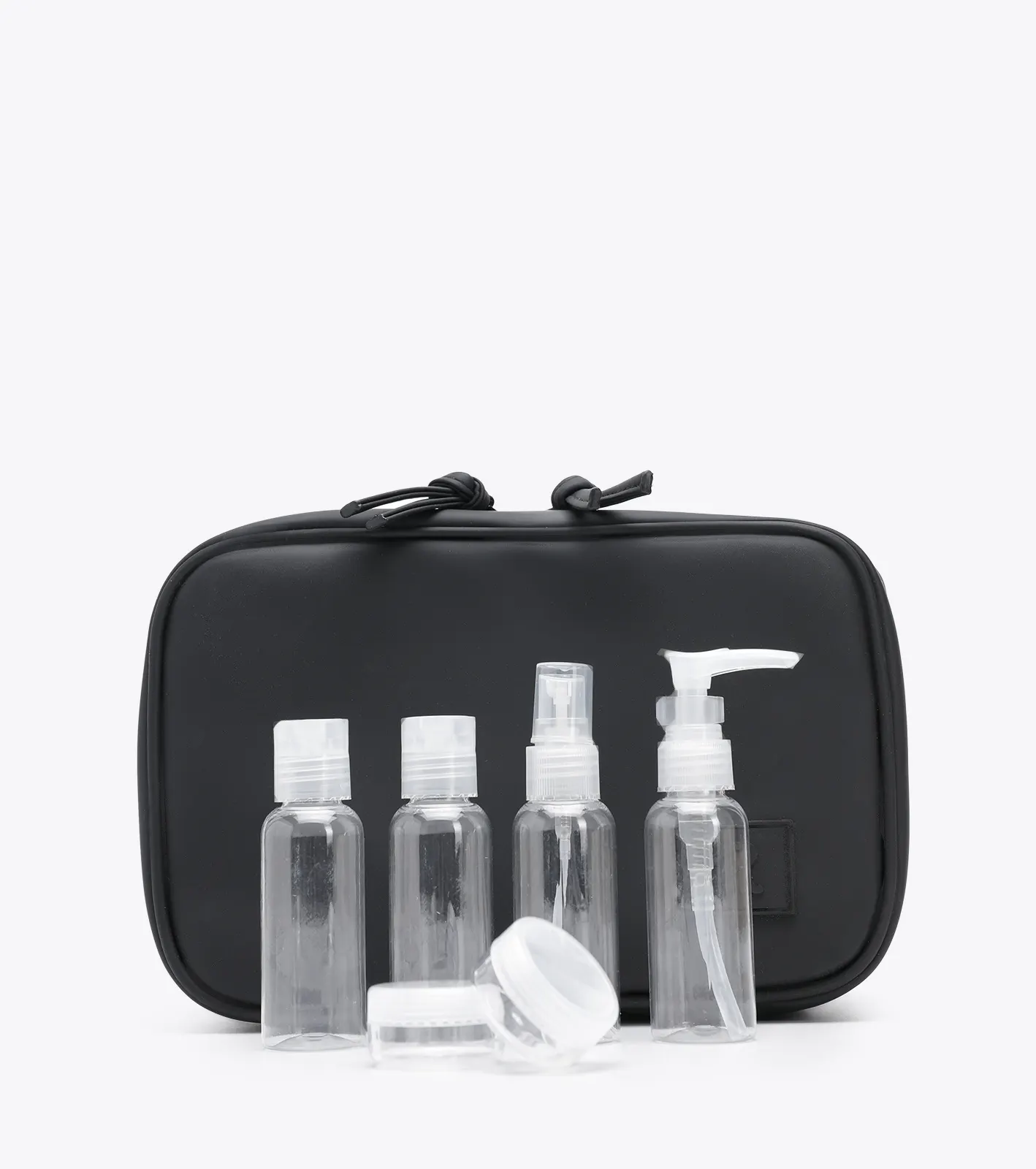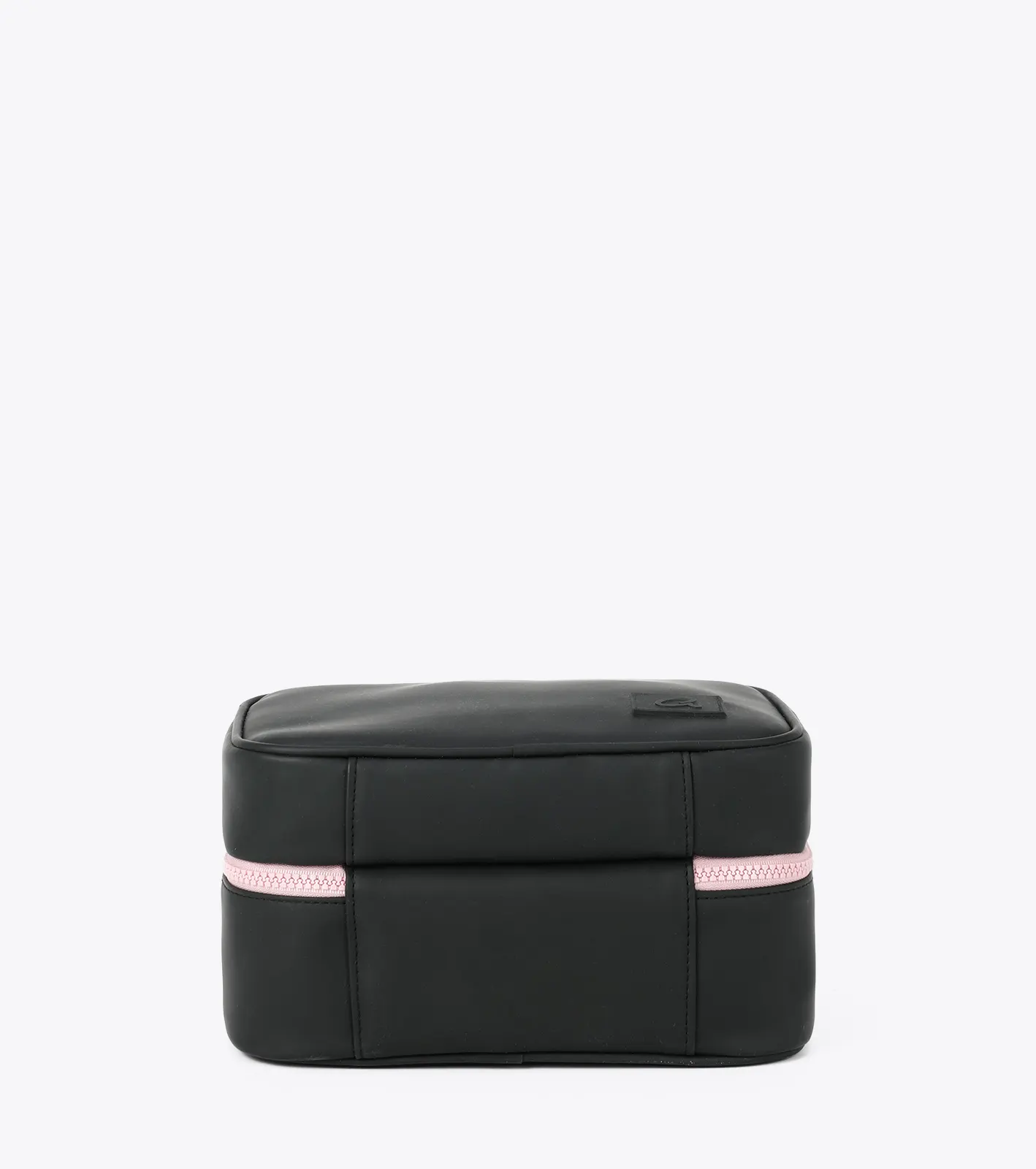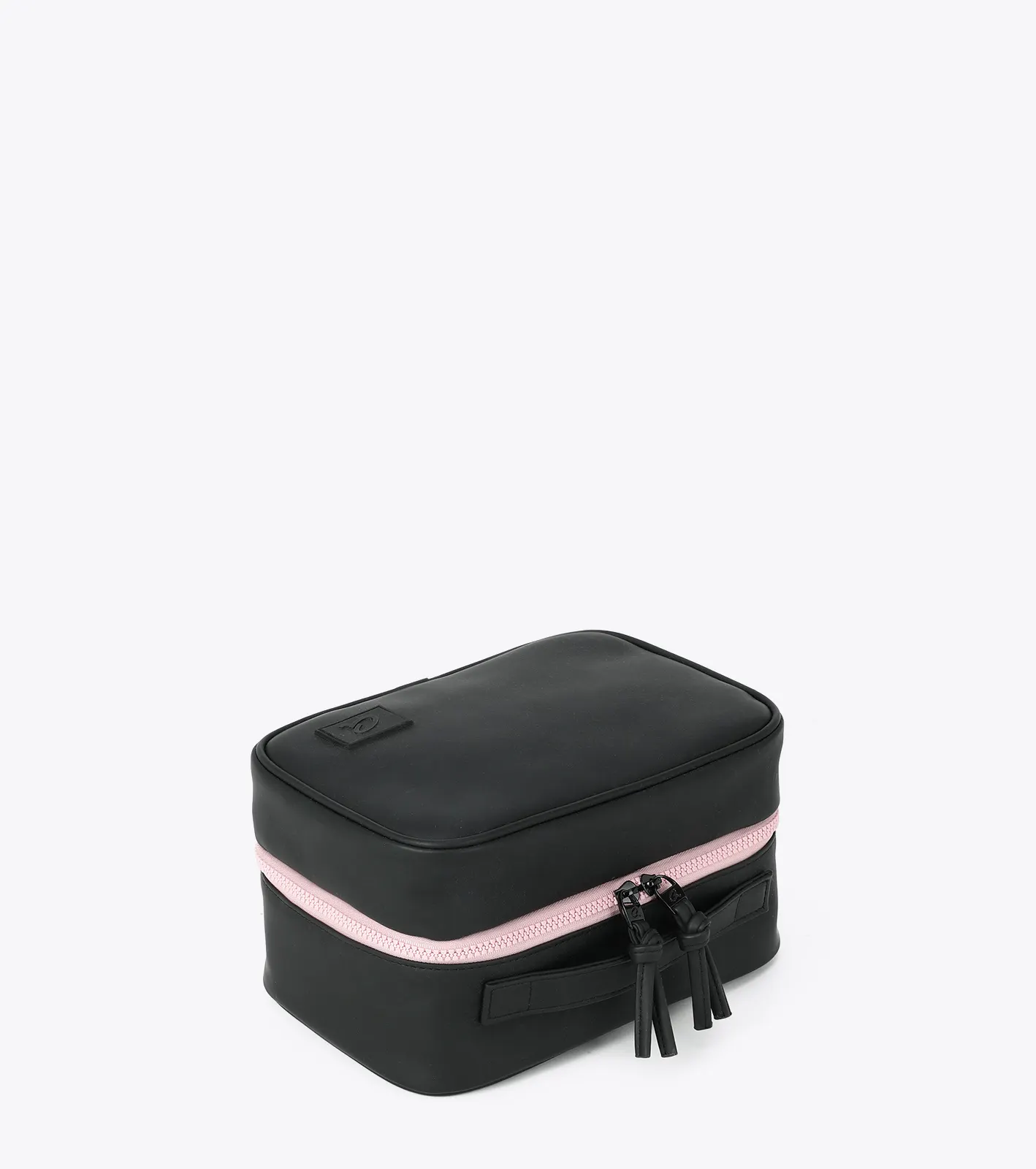 Γυναικείο νεσεσέρ ταξιδίου σε μαύρη απόχρωση με ροζ λεπτομέρεια φερμουάρ. Στο εσωτερικό του είναι επενδυμένο με φόδρα και περιέχει δύο διάφανες αποσπώμενες κασετίνες, θέσεις για πινέλα, διάφανη θήκη με φερμουάρ και άδεια μπουκαλάκια για ρευστά αντικείμενα. Ένα απαραίτητο αξεσουάρ για κάθε ταξίδι.
