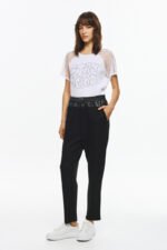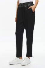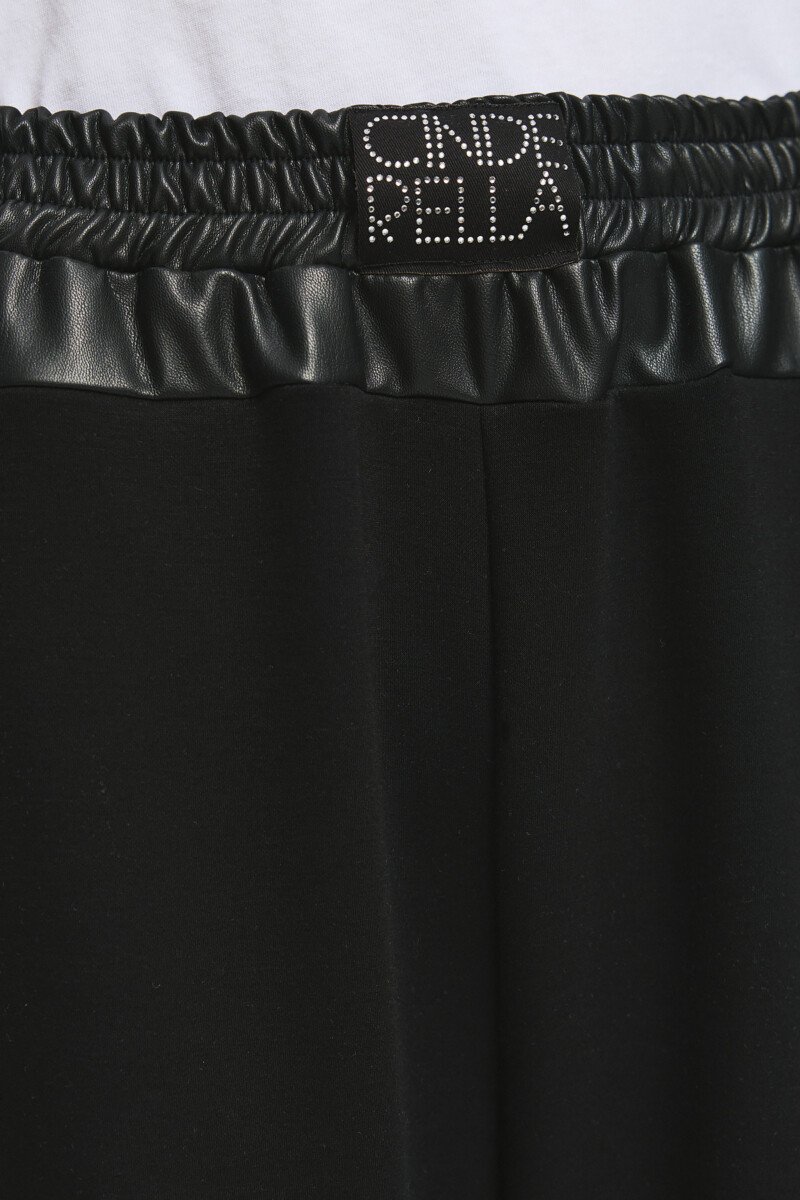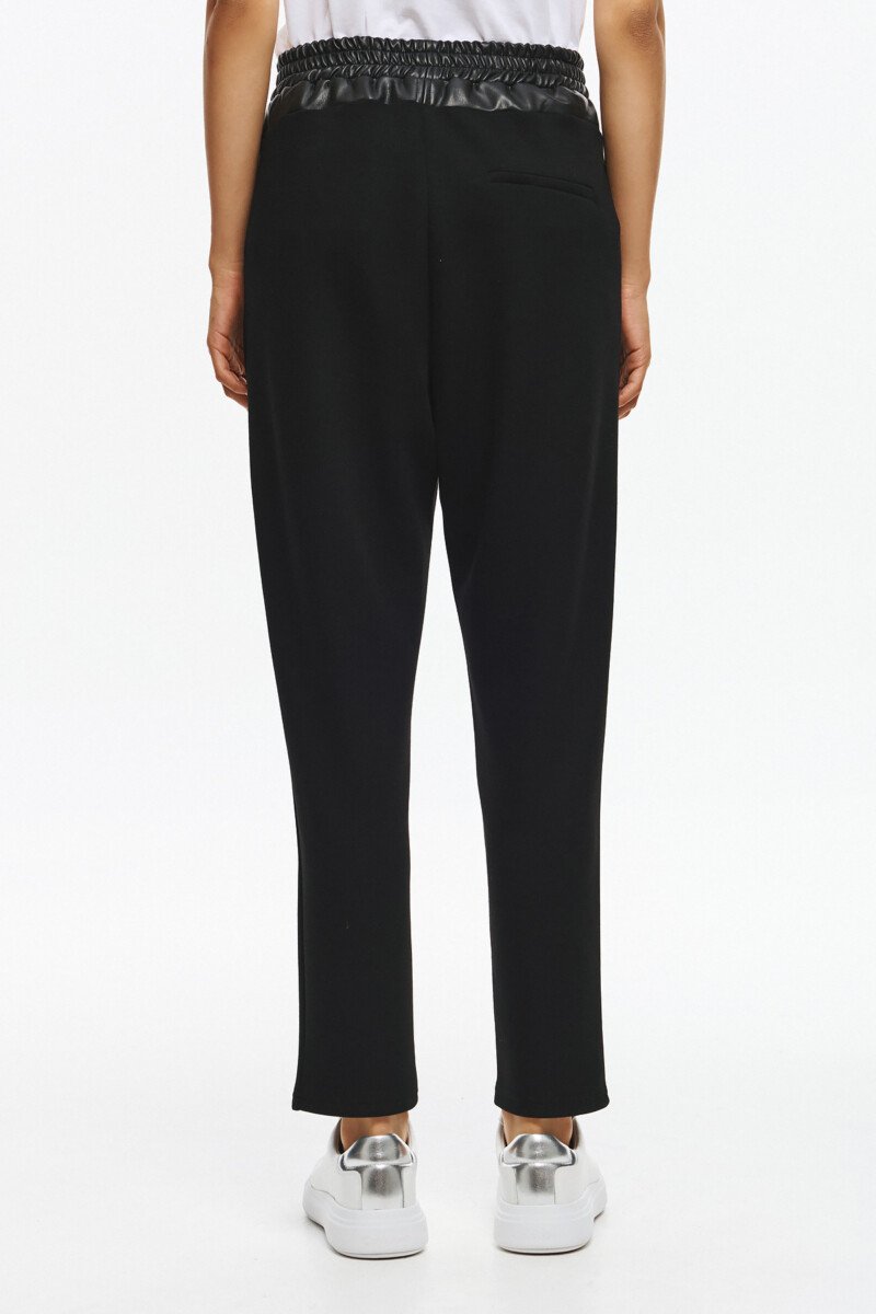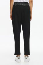 Παντελόνι με ελαστική μέση και λεπτομέρειες με δερματίνη και λεπτά στρασάκια στο λάστιχο. Άνετη γραμμή με τσέπες και minimal σχεδιασμό ιδανικό για καθημερινές stylish εμφανίσεις.