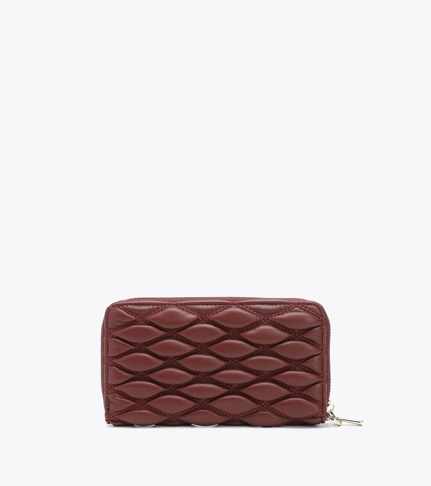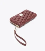 Γυναικείο πορτοφόλι Tiril, κατασκευασμένο από τεχνόδερμα με ξεχωριστή καπιτονέ όψη. Εσωτερικά είναι φοδραρισμένο και περιέχει μία θήκη φερμουάρ, πολλαπλές θέσεις για κάρτες, όπως και θέσεις για χαρτονομίσματα. Ασφαλίζει με φερμουάρ και διαθέτει επιπλέον αποσπώμενο λουράκι καρπού για να μπορεί να κρατηθεί και στο χέρι.