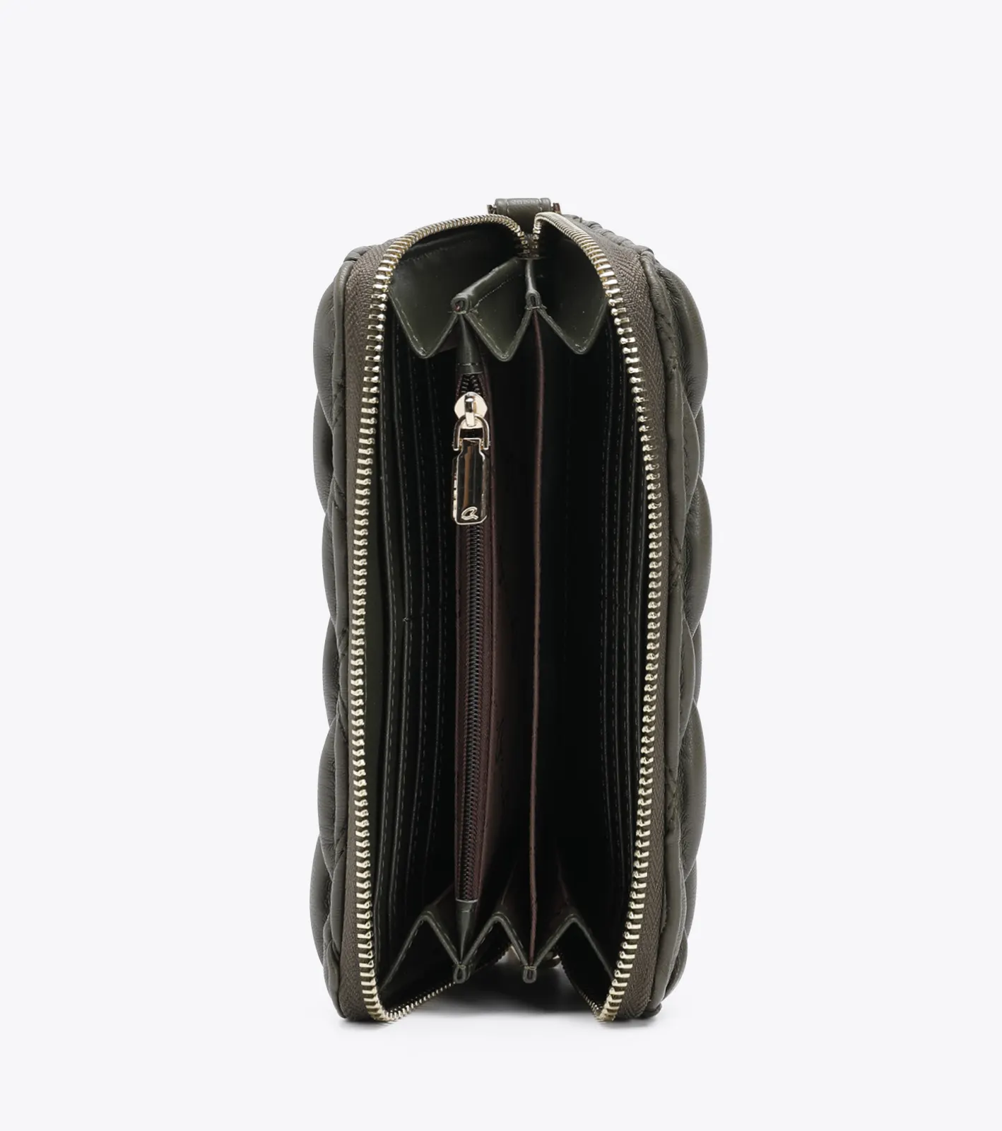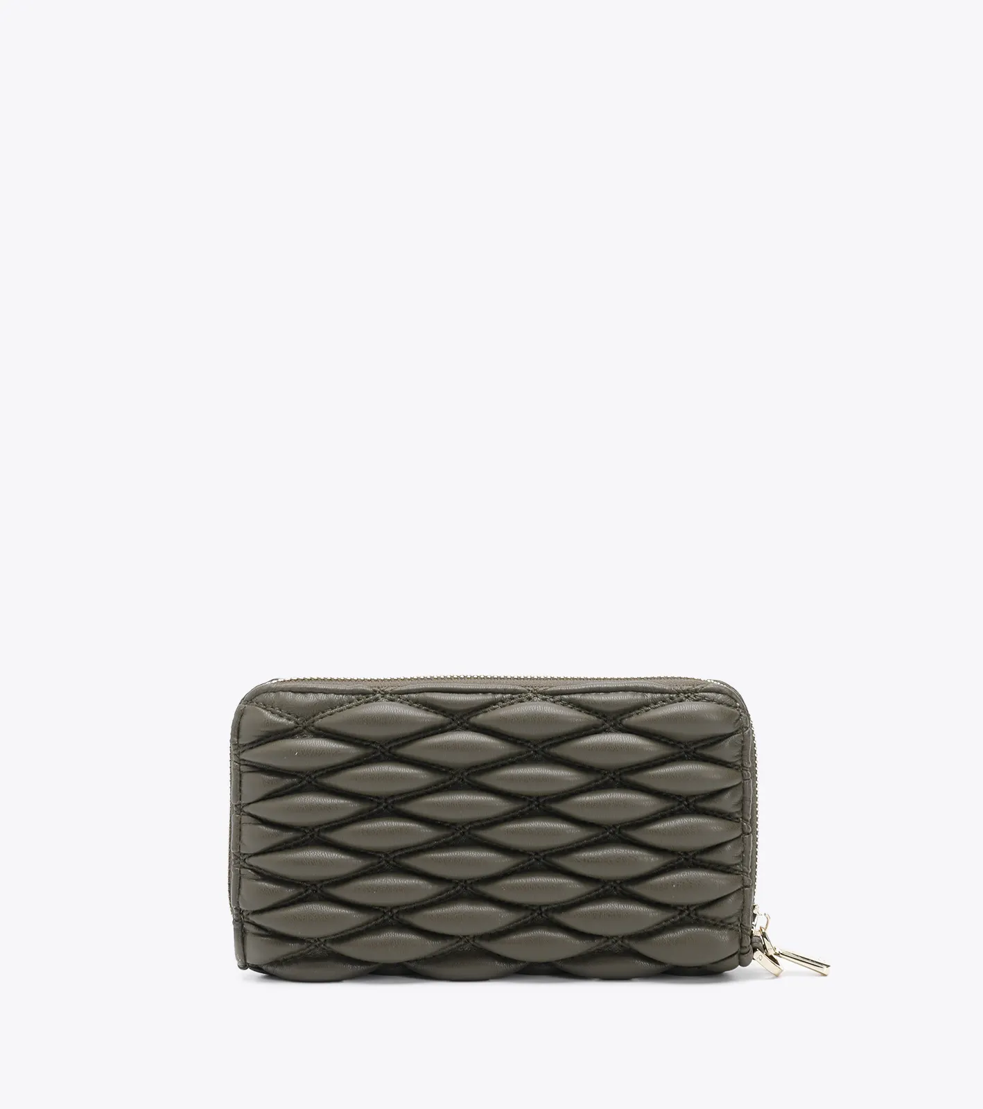 Γυναικείο πορτοφόλι Tiril, κατασκευασμένο από τεχνόδερμα με ξεχωριστή καπιτονέ όψη. Εσωτερικά είναι φοδραρισμένο και περιέχει μία θήκη φερμουάρ, πολλαπλές θέσεις για κάρτες, όπως και θέσεις για χαρτονομίσματα. Ασφαλίζει με φερμουάρ και διαθέτει επιπλέον αποσπώμενο λουράκι καρπού για να μπορεί να κρατηθεί και στο χέρι.