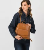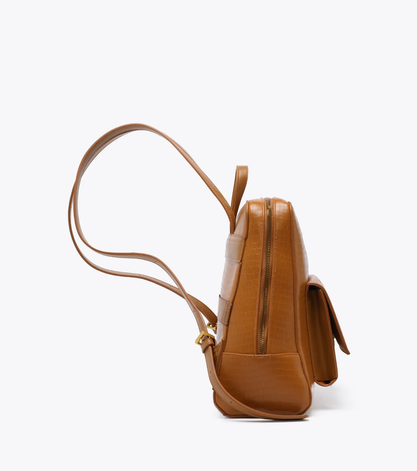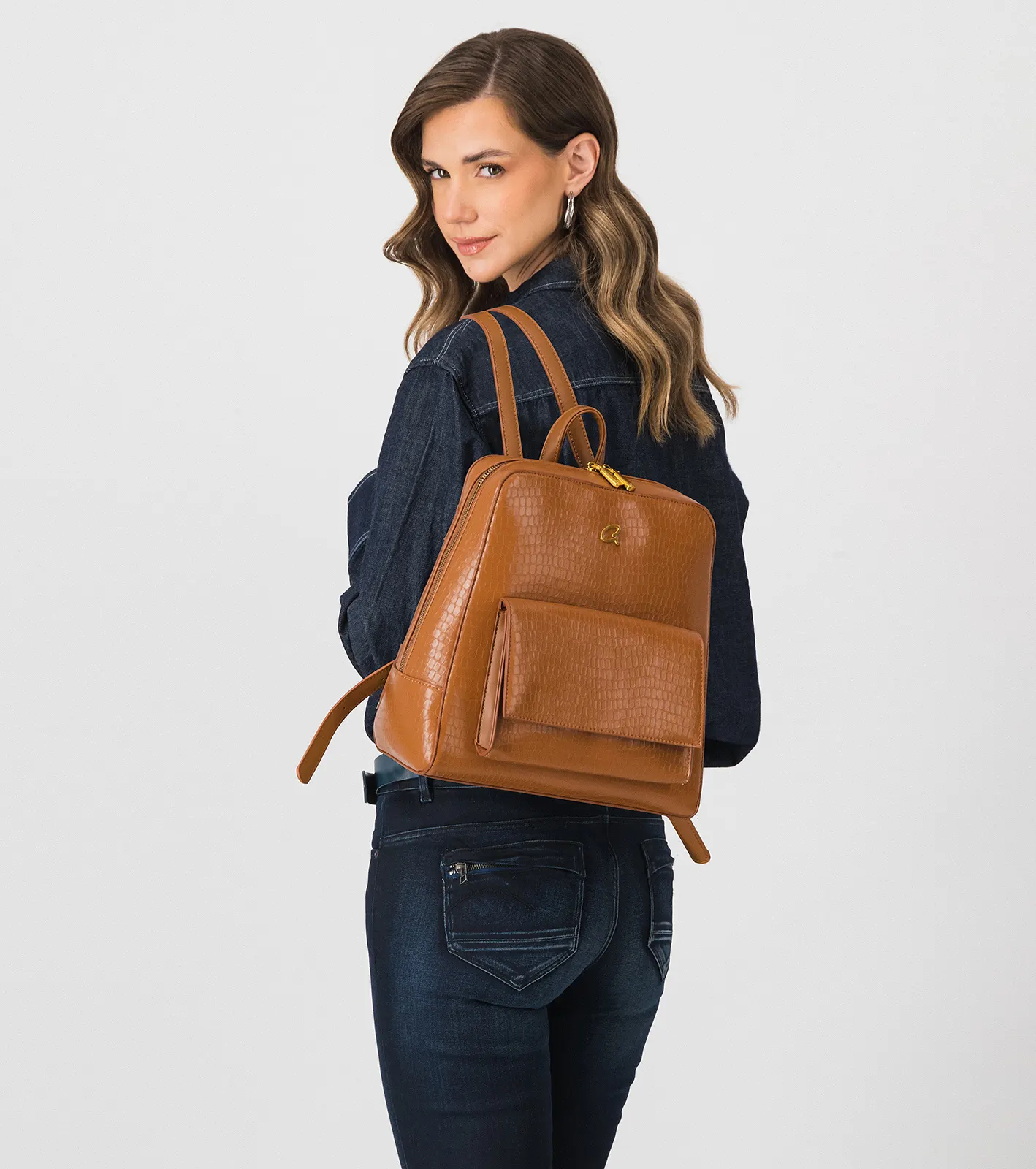 Γυναικείο σακίδιο πλάτης Avelina, από τεχνόδερμα με κροκό υφή. Είναι επενδυμένο στο εσωτερικό του με φόδρα, και περιέχει μία τσέπη με φερμουάρ και δύο ανοιχτές θέσεις για οργάνωση. Επιπλέον, διαθέτει θήκη με καπάκι στην μπροστινή όψη που κλείνει με κούμπωμα και ρυθμιζόμενα λουράκια πλάτης. Με χρυσές χάλκινες λεπτομέρειες και διπλό φερμουάρ για ευκολία στη χρήση. Ένα μοντέρνο αλλά και ταυτόχρονα κλασικό σακίδιο που συνδυάζεται εύκολα με κάθε outfit.