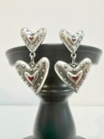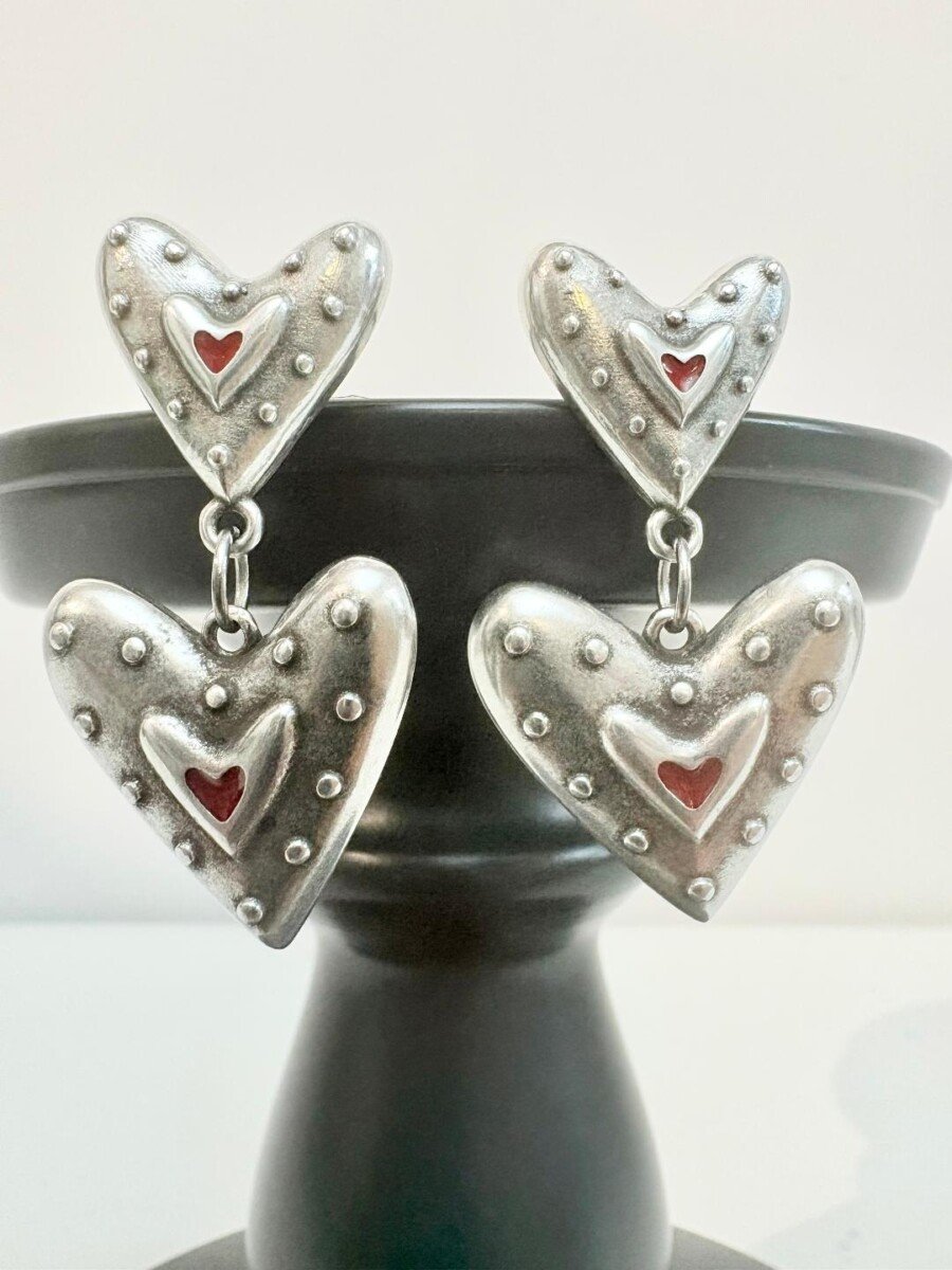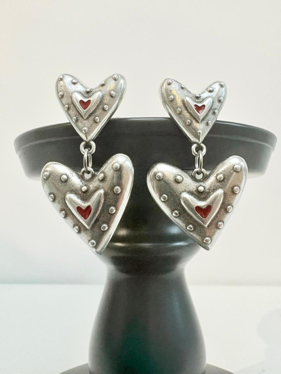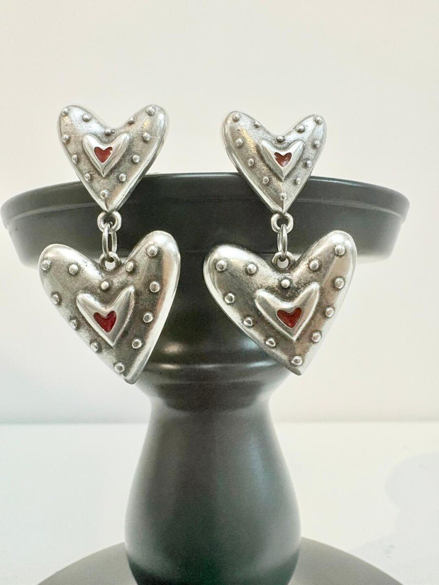 Χειροποίητα σκουλαρίκια σε vintage στύλ με καρδιές επάργυρες με ασήμι 925 και κόκκινο σμάλτο